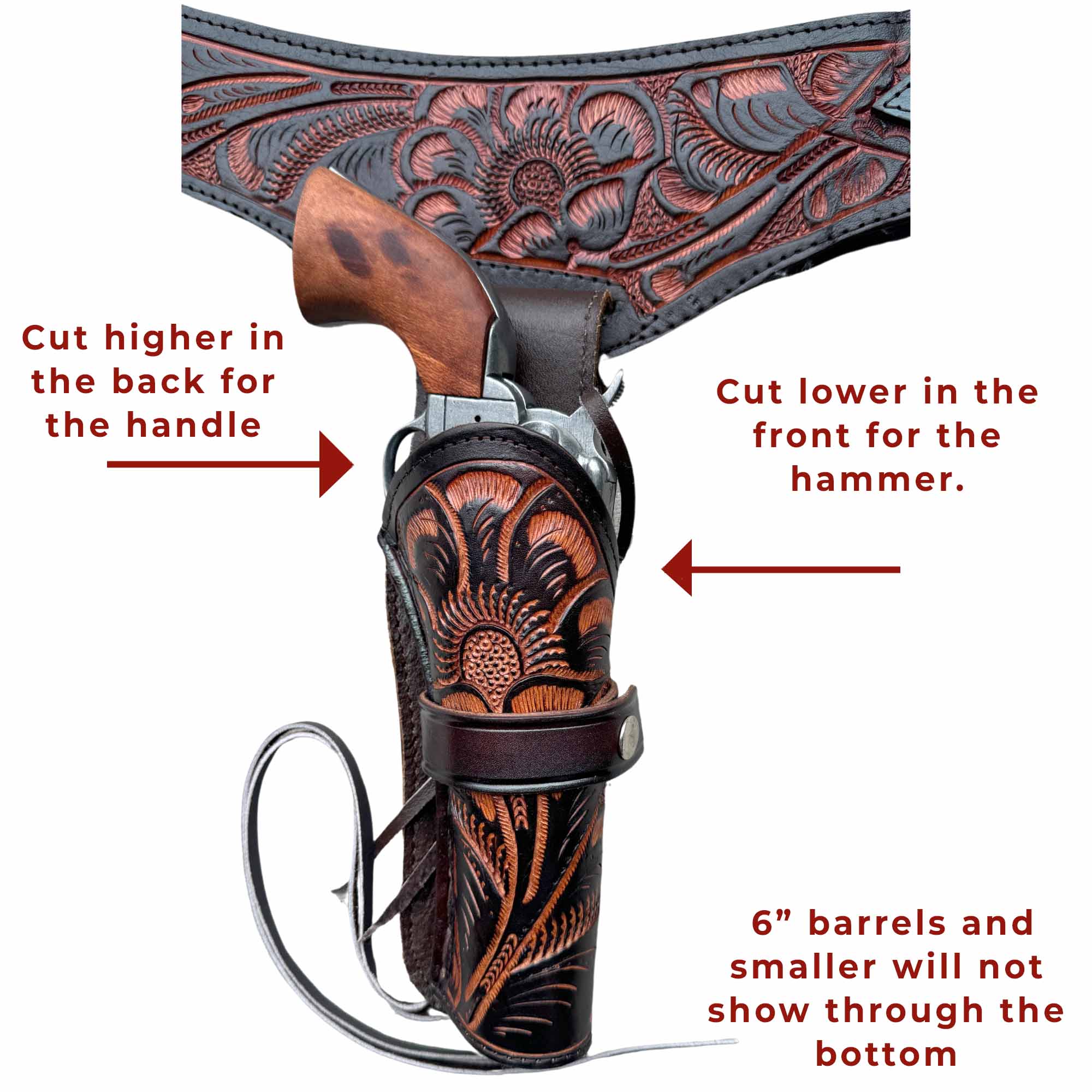 Genuine, handmade leather cowboy revolver cross draw holster for .44/ .45 caliber ammo. This handcrafted gun belt is made of thick, durable leather with beautiful western style tooling designs throughout. Perfect fit for all top selling revolvers including Smith and Wesson, Ruger, and Uberti. This makes the perfect present or gift for gun enthusiasts, trick shooters, revolver lovers or anyone looking to spice up their authentic Mexican cowboy costume. Should fit all major brand handguns with .44 /.45 caliber ammo
