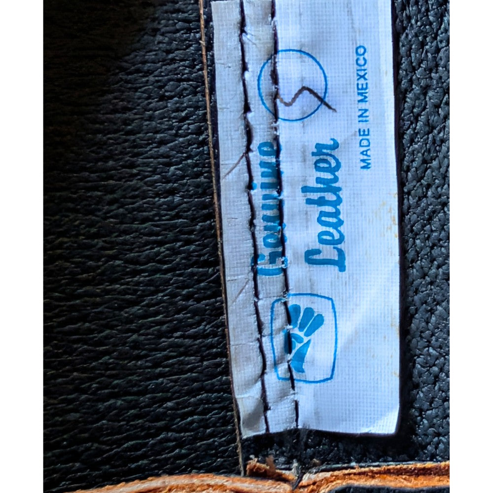 Built for long days and real work, this brown leather cowboy hat is handmade in Mexico with a wide brim for sun coverage and a structured crown that holds its shape. A braided leather hatband with silver conchos adds classic western grit without getting fussy. Inside, a black leather lining and elastic sweatband help the hat stay put when you’re riding fence, moving stock, or running into town.