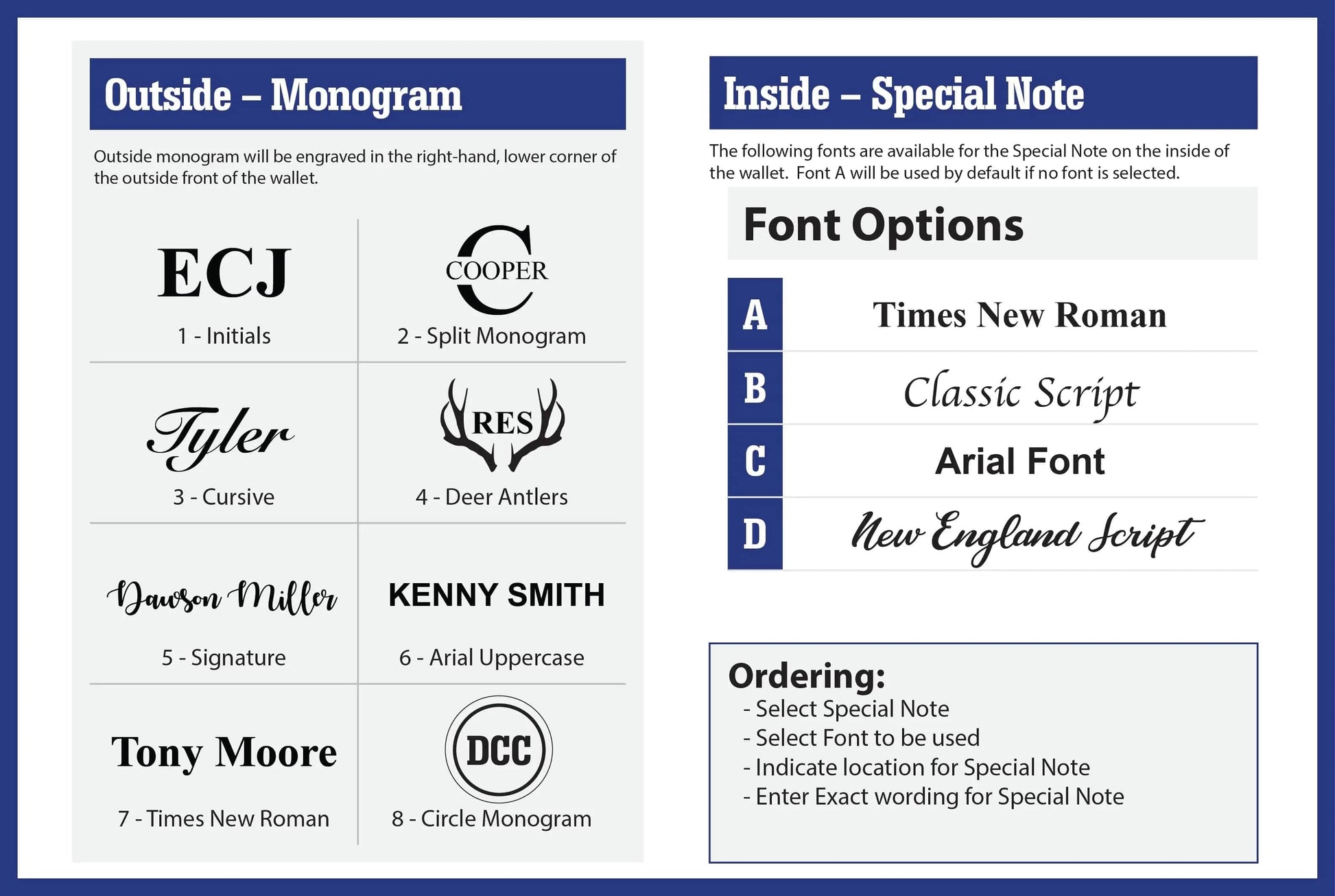 - Option to personalize you wallet on the right front bottom corner. Variety of designs available.